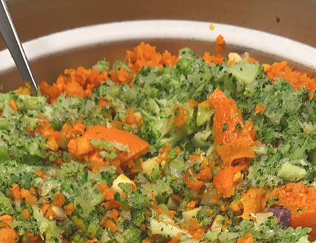 食材の持つ栄養素を可能な限り損なわないよう、例えば野菜であれば加熱するために「煮る」(栄養素が水分に流れ出てしまうため)ことはせず、「蒸す」ことにこだわります。にんじんやブロッコリーのように食物繊維が豊富で、愛犬の身体構造上消化することが苦手な食材は、可能な限り細かくカットして、消化しやすい形状にしています。
