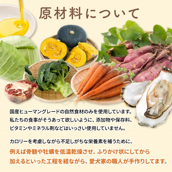 栄養の宝庫であるレバー、海の完全栄養食といわれる牡蠣、コラーゲンやコンドロイチンが豊富な骨髄や、ビタミンEやリノール酸が豊富なひまわり油など、愛犬のカラダが求める食材を贅沢に配合しました。