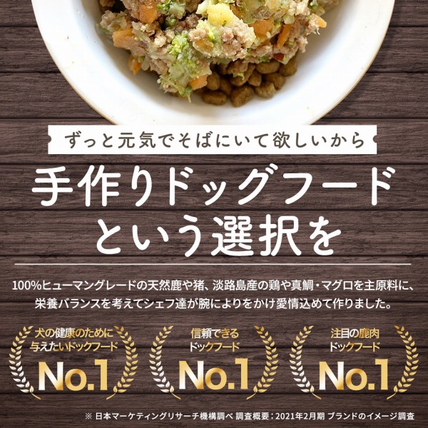 最新の2016年AAFCO栄養基準と2006年NRC飼養標準に準拠。 天然鹿やヒューマングレードの猪肉、淡路島由良産の天然真鯛と新鮮野菜をメインに、 鹿骨やレバー、牡蠣などの自然素材だけで 栄養バランスを調整した手作りごはんができました。自然食材を100%使用。グレインフリー。食材を厳選していますのでアレルギーケアにおすすめ。主食として、トッピング用としてもお使いください。