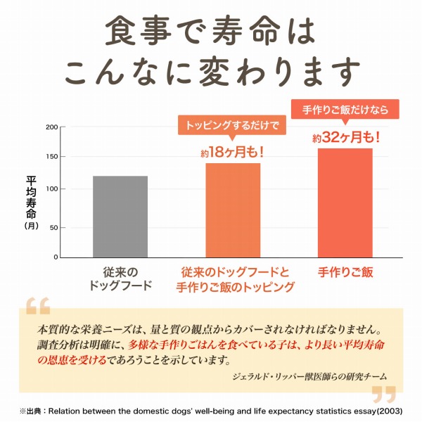 ペット先進国であるヨーロッパで行われた大規模調査で、従来のドッグフードだけでは平均寿命が10.4歳だったに対し、ドッグフードに手作りごはんをミックスした子の平均寿命は11.9歳、手作りごはんだけを食べている子の平均寿命は13.1歳※1という統計があります。