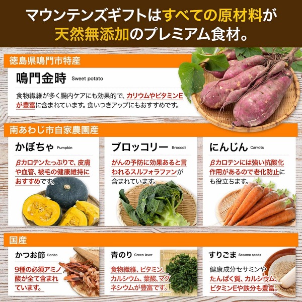 - 鶏肉、さつまいも、かぼちゃ、にんじん、ブロッコリー、かつお節粉末、すりごま、青のり