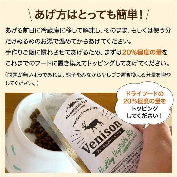 手作りご飯に慣れさせてあげるため、まずは20%程度の量をこれまでのフードに置き換えてトッピングしてあげてください。