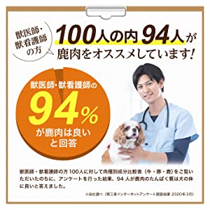 94%の方が鹿肉をおすすめ。 - 2020年3月に第三者リサーチ機関にインターネット調査を依頼し、牛、豚、鹿による成分比較表をご覧いただいたのちにアンケートを行った結果、獣医師・獣看護師の皆さまから鹿肉に対して高い評価をいただくことが出来ました。