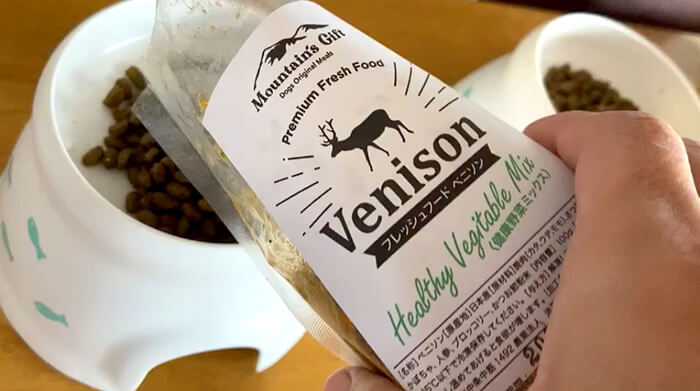 日本鹿の赤身肉を50%以上使用し、淡路島の自家農園で栽培した、かぼちゃ、にんじん、ブロッコリーに、徳島県特産の鳴門金時をミックスした手作りごはんです。