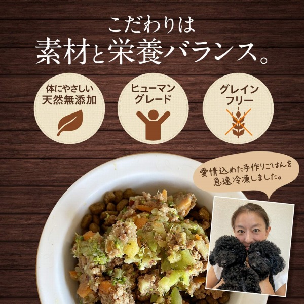 愛犬家の職人がヒューマングレードの鹿肉と新鮮野菜を愛情を込め、栄養バランスを考えて手作りしたフレッシュフードと鹿肉ミンチを急速冷凍してセットでお届けします。