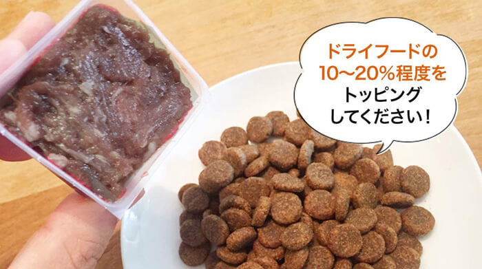 手作りご飯に慣れさせてあげるため、まずは20%程度の量をこれまでのフードに置き換えてトッピングしてあげてください。(問題が無いようであれば、様子をみながら少しづつ置き換える分量を増やしてください。)
