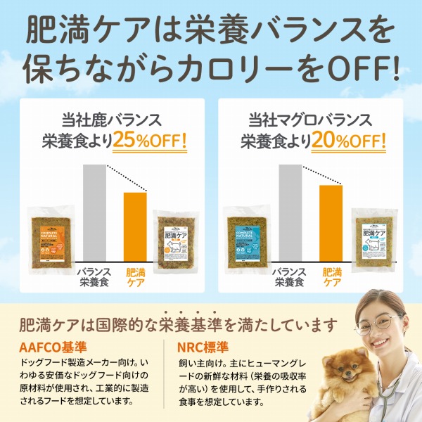 ダイエットしながら健やかなカラダを維持できるよう、当社バランス栄養食よりカロリーを20%カット。高タンパク・低脂質のマグロをメインのタンパク源に、カロリーを抑えつつ、最新版のAAFCO栄養基準とNRC飼養標準を満たすようバランス良く食材を配合しました。