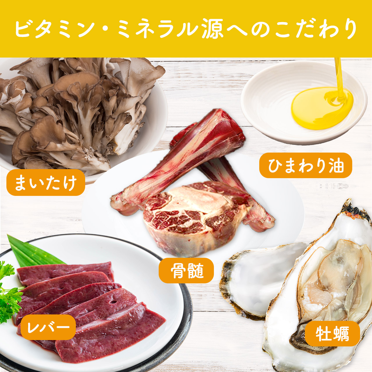 栄養の宝庫であるレバー、海の完全栄養食といわれる牡蠣、コラーゲンやコンドロイチンが豊富な骨髄や、ビタミンEやリノール酸が豊富なひまわり油など、愛犬のカラダが求める食材を贅沢に配合しました。