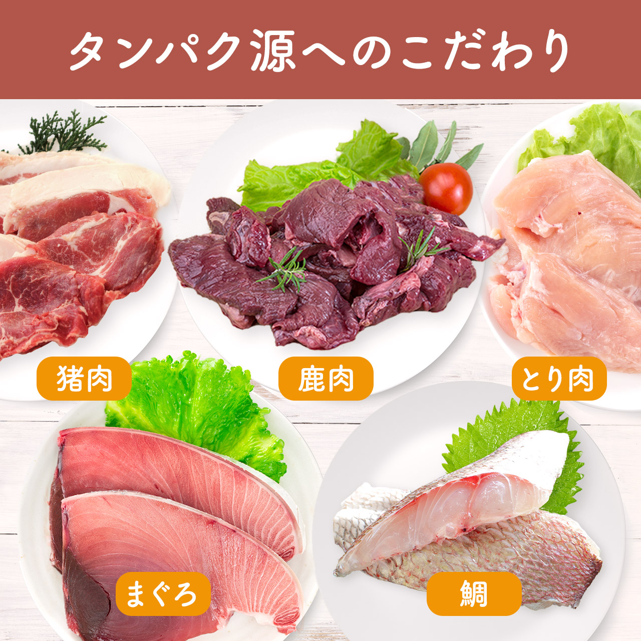愛犬にとって最も大切な栄養素であるタンパク源は5種類から。すべてヒューマングレードの高品質な食材を使用しています。