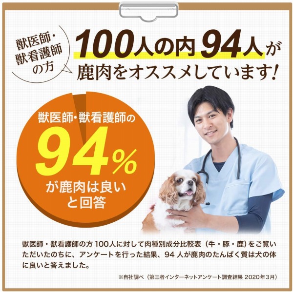94%の方が鹿肉をおすすめ。 - 2020年3月に第三者リサーチ機関にインターネット調査を依頼し、牛、豚、鹿による成分比較表をご覧いただいたのちにアンケートを行った結果、獣医師・獣看護師の皆さまから鹿肉に対して高い評価をいただくことが出来ました。