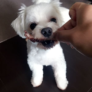 マルチーズのさくたろう君はあばら骨ジャーキーが大好物!いちどくわえたら無くなるまで離しません!!