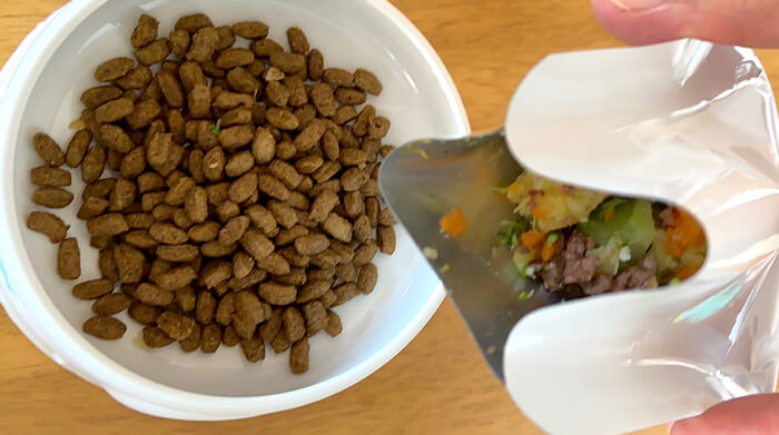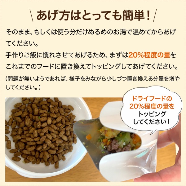 そのまま、もしくは使う分だけぬるめのお湯で温めてからあげてください。手作りご飯に慣れさせてあげるため、まずは20%程度の量をこれまでのフードに置き換えてトッピングしてあげてください。
